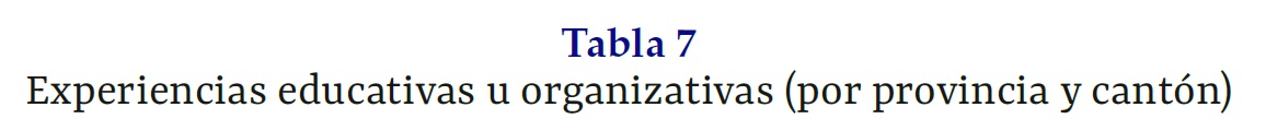 Experiencias educativas u organizativas (por provincia y cantón)