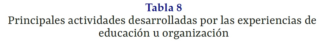 Principales actividades desarrolladas por las experiencias de educación u organización (%)
