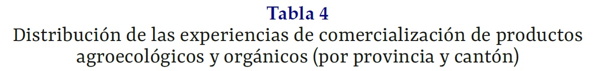 Distribución de las experiencias de comercialización de productos agroecológicos y orgánicos (por provincia y cantón)