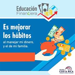 Descripción: se lee «Educación financiera es mejorar los hábitos al manejar mi dinero y el de mi familia», con el logo de Gobierno de Costa Rica en la parte inferior.