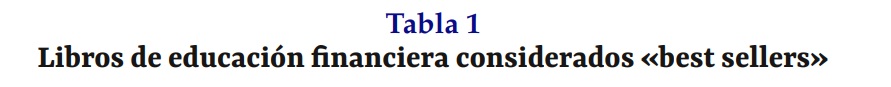 En última instancia, se reconoce en los antecedentes la proliferación de personas autoras que, principalmente a lo largo de las tres décadas pasadas, se han posicionado desde la lógica de mercado para vender sus libros considerados «best sellers», quienes presentan alta influencia y predominio como referente de las denominadas finanzas personales. Los libros a los que se hace mención se enlistan en la Tabla 1.