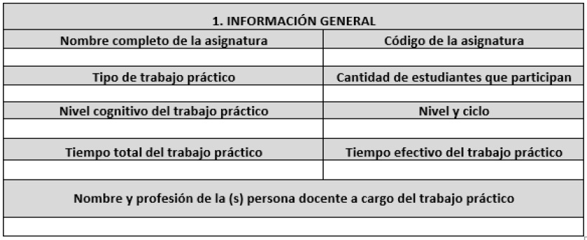 El primer cuadro de la plantilla recopila información general del trabajo práctico como nombre de la asignatura, código, tipo de trabajo, cantidad de estudiantes, nivel cognitivo, nivel, ciclo, cantidad de horas prácticas y nombre del docente a cargo, tal y como se muestra en la Figura 1.