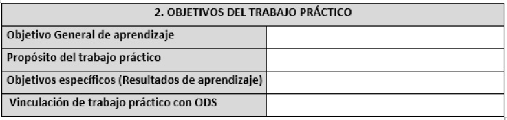 Fuente: Captura de pantalla del original, cuadro ajustado a las necesidades de las carreras 00080 y 00110 de la UNED, basada en Madrigal (2019).El segundo cuadro (Figura 2) presenta los objetivos generales de aprendizaje, el propósito del trabajo práctico y su vinculación con los Objetivos de Desarrollo Sostenible (ODS) que promueve la universidad. El objetivo general debe crearse a partir del objetivo de aprendizaje y los contenidos del diseño curricular. Los objetivos específicos, entonces se crean a partir de tres aspectos conceptuales: teórico, procedimental y actitudinal, por lo que el trabajo práctico debe tener un objetivo sobre los contenidos teóricos (saber qué) para el logro del aprendizaje, un segundo objetivo sobre los procedimientos o técnicas (saber hacer) que requiere que el estudiante comprenda y aplique, y un último objetivo sobre las actitudes (saber ser) que el estudiantado adquiera con el trabajo práctico.