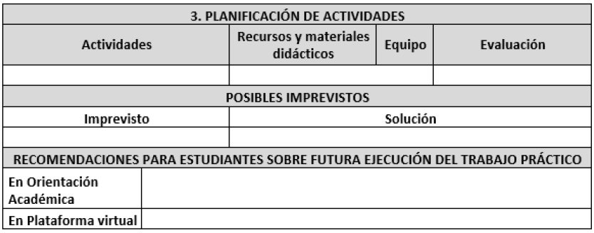 La plantilla «Planeamiento didáctico para trabajos prácticos» de la Guía se basa en la Plantilla para planificación de giras de campo realizada por Madrigal en el 201918, pero adaptada a las particularidades propias de las carreras de turismo y a los diferentes tipos de trabajos prácticos identificados anteriormente.