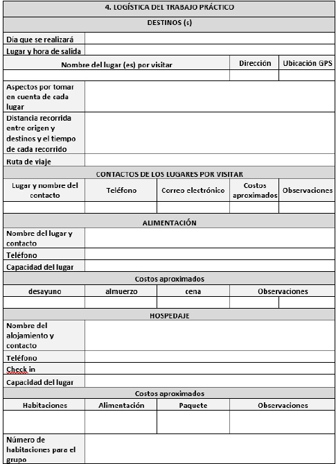 Fuente: Captura de pantalla del original, cuadro ajustado a las necesidades de las carreras 00080 y 00110 de la UNED, basada en Madrigal (2019).El cuarto cuadro pertenece a la logística del trabajo práctico donde se enlista el destino, los contactos, los sitios a visitar y los costos aproximados. Esta información es importante porque no siempre la persona docente que planifica el trabajo práctico es la que lo ejecuta, y contar con estos datos facilita el control del destino. Igualmente permite incluir con anticipación en las orientaciones académicas y las plataformas virtuales los aspectos logísticos que el estudiantado pueda valorar al momento de la matrícula como el presupuesto requerido y el destino por conocer. Finalmente, estos datos se irían recopilando y guardando en bases a modo de proveedores o aliados para que el equipo docente planificador consulte y determine si el destino turístico aplica para otra visita bajo otro objetivo y en otra asignatura. La Figura 4 muestra los aspectos necesarios para cumplir con esta logística.
