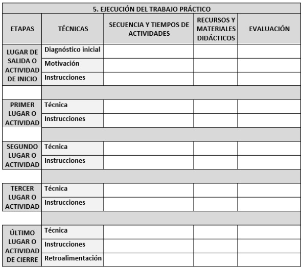 Fuente: Captura de pantalla del original, cuadro ajustado a las necesidades de las carreras 00080 y 00110 de la UNED, basada en Madrigal (2019).El quinto cuadro guía en la ejecución del trabajo práctico (Figura 5), es la información de lo que se hará durante el desarrollo de este, sirve para definir la metodología requerida, los tiempos destinados para cada actividad didáctica, los recursos y materiales propuestos con anterioridad, así como definir los criterios de evaluación de cada etapa. Esta sección es útil ya que de ella se desprende información para el estudiantado como el cronograma, las prácticas, recursos y materiales que se le deben brindar. Cada docente ejecutor sigue la información y conforme se desarrolla puede anotar información sobre ajustes y mejoras que alimentarán el último cuadro de la plantilla.