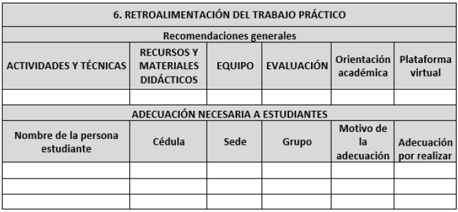 Mientras tanto las cátedras han implementado el uso digital de la Guía en formatos Excel o Word; sin embargo, como este proceso requiere tiempo no todas las personas docentes la aplican eficientemente y peligra la pérdida de la información, si no esta no es guardada de forma debida. Es necesario, que desde la carrera se realice un estudio sobre la continuidad de uso de la Guía Metodológica y la estandarización de los procesos de planificación de trabajos prácticos desde el 2023 y con miras al siguiente compromiso de mejoramiento en la reciente reacreditación de las carreras. Además, puede quedar en archivos exclusivos de cada cátedra sin ser socializada por todo el cuerpo docente de las carreras.