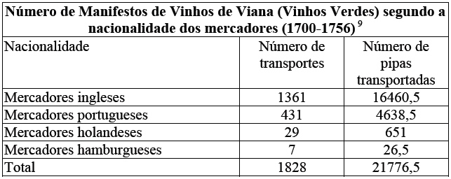 Certo é que, anteriormente a 1678, uma parte dos vinhos de qualidade que se produziam nas terras do norte de Portugal deixavam o país pelo porto de Viana do Castelo que, pelo menos até 1730, teve a sua barra desimpedida, funcionando assim como porta de saída dos Vinhos Verdes para os mercados da Europa do norte, tocados por mercadores ingleses que se fixaram na cidade da foz do Rio Lima (Sellers, 1899: 19). Só vencida a década de vinte do século XVIII, os vinhos do Douro ganharam claramente a dianteira das exportações portuguesas de vinhos (Cardoso, 2003: 281).