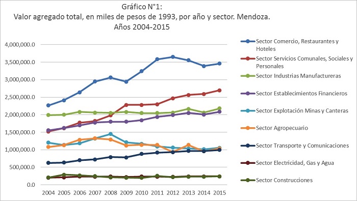 Económicamente, la provincia de Mendoza ha pasado a caracterizarse por la producción de servicios y la creciente participación del sector comercio, restaurantes y hoteles en términos del valor total de la producción o producto bruto geográfico (PBG).[5] El sector servicios en conjunto representa el 66% del producto total y dentro de estos, el subsector comercios, restaurantes y hoteles explica el 25% (2015). Con tendencia creciente destacan los servicios comunales, sociales y personales (19%),[6] los financieros, inmobiliarios, empresariales y de alquiler (15%) y transporte, almacenamiento y comunicaciones (7%). El valor aportado anual de cada sector del producto geográfico (en pesos de 1993, tal como vemos en el Gráfico 1) evidencia la creciente contribución del sector productor de servicios (incluido comercio), mientras el sector industrias manufactureras ha mantenido su aporte relativo a la economía regional sin grandes sobresaltos.