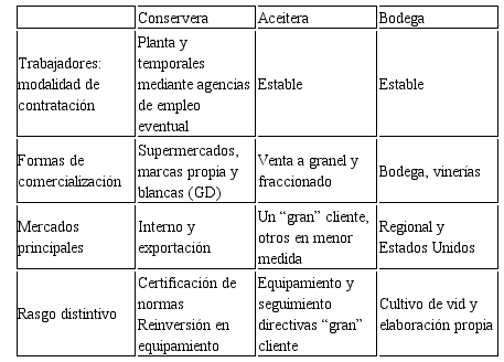 Los casos son de una conservera, una aceitera y una bodega (Tabla 1). En el primer caso, la empresa fue fundada en 1964 y se dedica a la elaboración de conservas de frutas y hortalizas (frutas en almíbar, dulces, salsas, cóctel de frutas). En el transcurso de 90 días en tres turnos de trabajo, empleando en promedio 400 trabajadores, realizan la mayor parte de la producción.