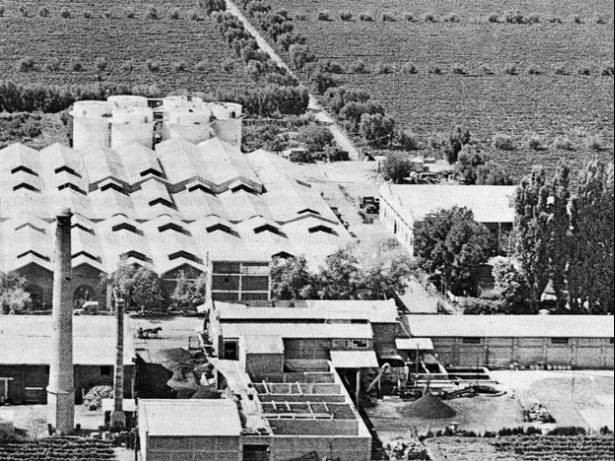 Vista aérea de las instalaciones de la empresa Gargantini en La Florida, Rivadavia. En el primer plano se encuentra la destilería de aguardientes con su chimenea. En segundo plano se ven los galpones que albergaban las cubas de roble. Detrás de ellos se encuentran las instalaciones para el sistema de fermentación continua, con forma de seis cilindros blancos. Más atrás, viñas y olivos. Fuente: foto circa, 1970.