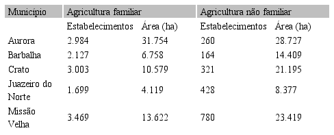 Consideramos agricultor rural aquele proprietário de pequenas terras que conta com a mão de obra familiar para o trabalho e gestão da produção de subsistência. Nesse sentido, recorremos à família agricultora que tem como base a mão de obra do campo, correspondendo a 82,9% no Nordeste brasileiro. Nesse cenário, o estudo de Carneiro (2008) enfoca a agricultura familiar e suas atividades agrícolas e não agrícolas no Plano de Desenvolvimento de Agronegócios na dinâmica do meio rural caririense. Conforme a tabela 2, o Cariri possui 57.493 estabelecimentos da agricultura familiar; correspondendo 52.030 estabelecimentos da agricultura familiar, abrangendo área de 399.639 hectares; e 5.463 estabelecimentos são da agricultura não familiar, correspondendo a 353.631 hectares, e esse setor produtivo apresenta as seguintes características:
