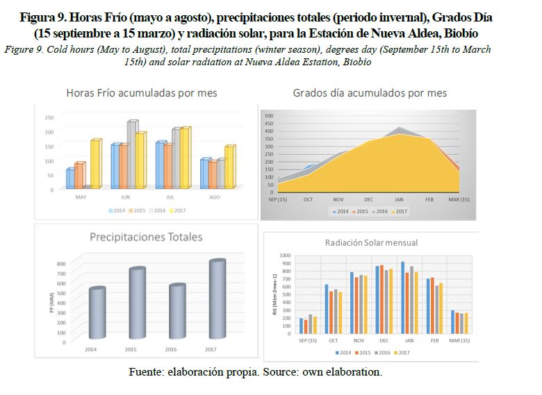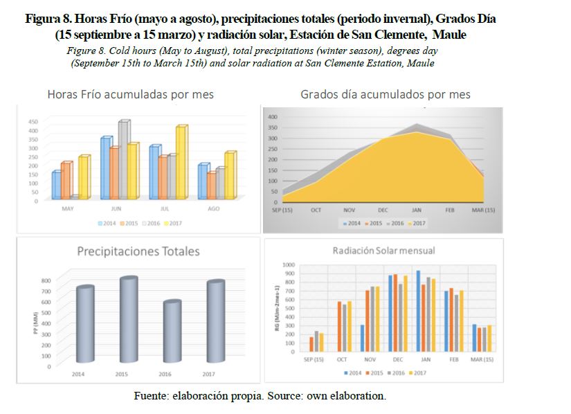 Esta estación muestra normalmente un registro de heladas. En el periodo de agosto la ocurrencia de estas fue superior al normal, mientras que septiembre no registra heladas. El periodo de acumulación de frío invernal fue normal, y las precipitaciones fueron cercanas al promedio y superiores al acumulado el 2016. En el periodo de crecimiento la acumulación de grados día fue normal. La radiación solar recibida fue inferior normal, como se observa en la Figura 9. En el periodo de madurez el comportamiento del índice de Fregoni fue muy superior al promedio de los otros años