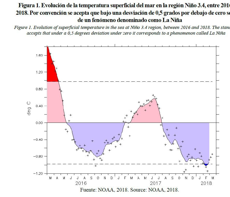 A diferencia del periodo anterior, el año 2017 estuvo marcado por la presencia del fenómeno de La Niña, registrándose temperaturas en la costa más frías que lo normal, situación que termina por regular las temperaturas, evitando la ocurrencia de eventos extremos (como los observados en el verano del 2017). La Figura 1 muestra la anomalía de la temperatura superficial del mar en la región Niño 3.4.