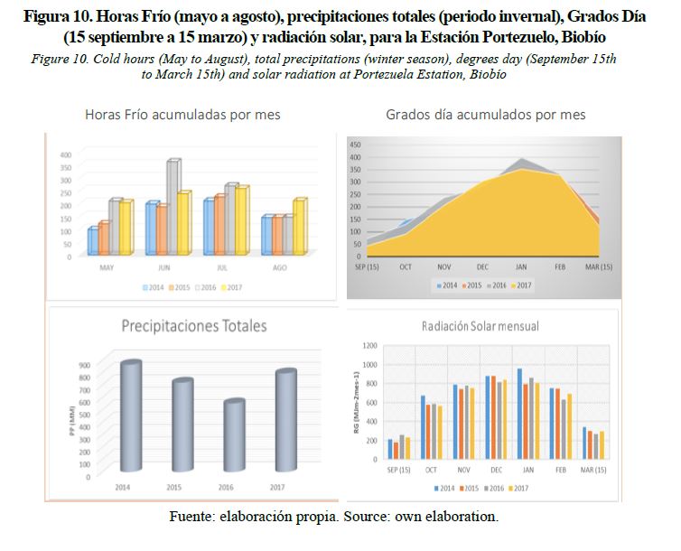 La Estación de Portezuelo suele registrar de heladas. En el periodo de agosto la ocurrencia de heladas fue superior a lo normal, mientras septiembre no ninguna. El periodo de acumulación de frío invernal fue normal. Las precipitaciones resultaron cercanas al promedio y superiores al acumulado el 2016. En el periodo de crecimiento la acumulación de grados día fue normal. La radiación solar recibida fue inferior al normal, como se observa en la Figura 10. En el periodo de madurez el comportamiento del índice de Fregoni resultó muy superior al promedio de otros años.