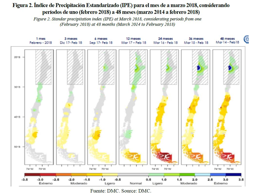 Esta situación se confirma al ver la evolución del Índice de Precipitación Estandarizado (IPE), donde los índices de corto plazo (bajo 12 meses) presentan prácticamente la desaparición, en todo el territorio, de condiciones de severidad de la sequía, tanto a nivel regional como comunal, como se observó en la Figura 2.