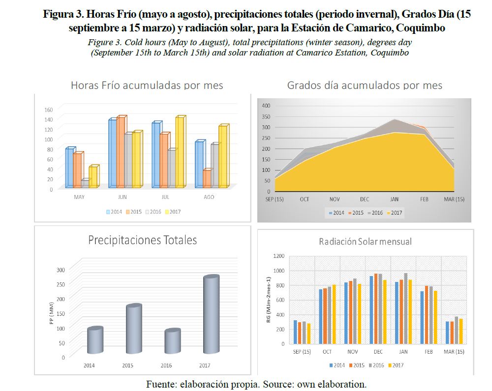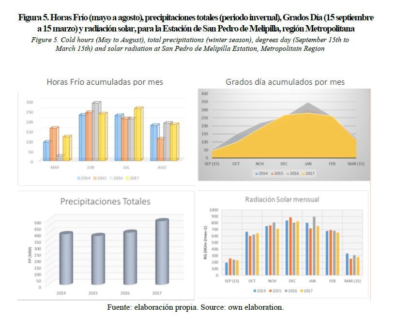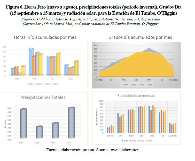 Esta estación normalmente muestra registro de heladas alto. Aunque ocurrieron eventos en el periodo de invierno y primavera, en la temporada reciente se registró un número inferior de eventos bajo cero grados en septiembre. El periodo de acumulación de frío invernal fue normal a alto, con una mayor acumulación en el mes de julio, lo que permite anticipar una brotación e inicio de temporada normal. Las precipitaciones fueron superiores al acumulado en los años anteriores, ubicándose cerca de los valores climatológicos normales. En el etapa de crecimiento la acumulación de grados día fue similar a las temporadas anteriores, pero inferior al registrado el 2016-2017. La radiación solar recibida fue semejante a los años previos—salvo la que se registra en el año 2016—, tal como se observa en la Figura 5. Enel período de madurez el comportamiento del índice de Fregoni fue inferior al deaños anteriores.