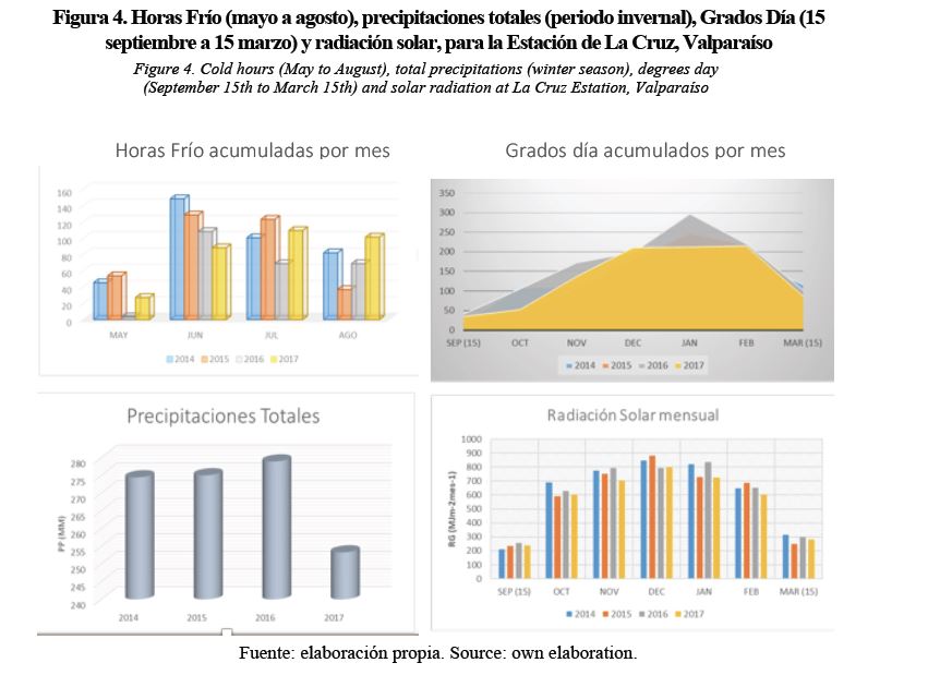 Esta estación normalmente muestra registro de heladas medio. Aunque ocurrieron eventos en el periodo de invierno estos no se presentaron en primavera. El periodo de acumulación de frío invernal fue normal a alto, con una mayor acumulación en el mes de julio y agosto, lo que favoreció una brotación e inicio de temporada normal. Las precipitaciones fueron superiores al acumulado en los años anteriores y comparables a las observadas el 2014. En el etapa de crecimiento la acumulación de grados día fue similar a las temporadas anteriores, pero inferior al registrado el 2016-2017. La radiación solar recibida fue semejante a los años previos, salvo la que se registró en el año 2016, como se observa en la Figura 6. A su vez, en el periodo de madurez el comportamiento del índice de Fregoni fue cercano al promedio, pero bastante inferior al observado el año 2016.