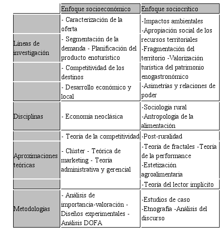 No obstante, los trabajos más recientes sobre enoturismo advierten una serie de efectos colaterales que se derivan de un abordaje o conocimiento unilateral que solo repara en aspectos económicos. Tal perspectiva plantea matizar los beneficios económicos a partir del abordaje del enoturismo como un fenómeno característico de la globalización y del sistema económico capitalista que incide en la reestructuración de los espacios rurales. Cabe señalar que la existencia de estudios sociocríticos para el enoturismo es escasa —salvo algunos casos en Francia e Italia—, de manera que los trabajos aludidos constituyen nuevas facetas de investigación que deberían ser abordadas en otros contextos donde se han agotado los trabajos de corte socioeconómico.