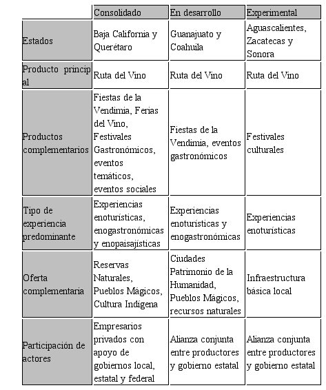 Por otro lado, las iniciativas muestran diferentes grados de desarrollo. Existen proyectos como las rutas de Baja California y Querétaro que pueden considerarse en un estado consolidado por la diversidad de la oferta, el dinamismo de su mercado, la institucionalización de las rutas, su impacto económico y su trascendencia en el posicionamiento turístico de cada estado. Otros proyectos se encuentran en etapa de desarrollo, principalmente los casos de las rutas de Guanajuato y Coahuila, regiones con una vitivinicultura arraigada y que han encontrado en el enoturismo una forma de proyección del territorio. Estas rutas aún no cuentan con un mercado estable y la oferta se compone de algunos aspectos básicos (recorridos, catas y maridajes, eventos) en un número reducido de bodegas y establecimientos locales. Las propuestas que se encuentran en una fase experimental son las rutas de Aguascalientes, Zacatecas y Sonora. Tales iniciativas permanecen en etapa de diseño, pero cabe resaltar que las bodegas ofertan actividades y servicios básicos como una estrategia de promoción de sus productos.
