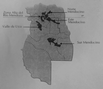 Como ámbito de dominación institucionalizada en la provincia de Mendoza, el complejo vitivinícola presenta sus propias particularidades (Quintero Palacios, 1995), al tiempo que, al interior de este subespacio nacional, podemos distinguir diferentes oasis productivos. Se constituyen en ese sentido cinco territorios en los que se desarrollan actividades ligadas al complejo productivo vitivinícola. A saber, la Primera Zona, el Valle de Uco, y los oasis Este, Sur y Norte (Figura 1).
