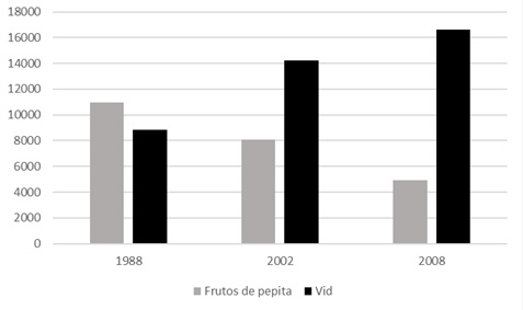 Tal panorama incluye desde fincas que abandonaron su tradicional cultivo de peras y manzanas para convertirse en vitícolas (Gráfico 1), hasta nuevos establecimientos agropecuarios en zonas cercanas al piedemonte, antes improductivas o marginales y de difícil acceso. En las últimas tres décadas ha ido retrocediendo el cultivo de frutos de pepita, en consonancia con una reestructuración general de las economías regionales de base agroindustrial (Rofman, 1999) y con las tendencias emanadas del proceso de reconversión vitivinícola, controlado por un grupo de empresas integradas verticalmente que lideran las transformaciones tecno-productivas y organizacionales (Gago, 2005).