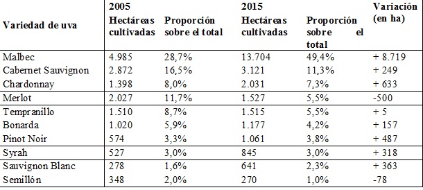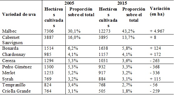 De acuerdo con las estadísticas de 2015 (Tabla 1) este es un territorio donde hay una concentración varietal entre Malbec y Cabernet Sauvignon: juntas reúnen el 60% de las variedades implantadas. Uno de nuestros informantes clave, especialista en el trabajo de extensión agropecuaria, nos señala algo que se corresponde con lo expuesto: