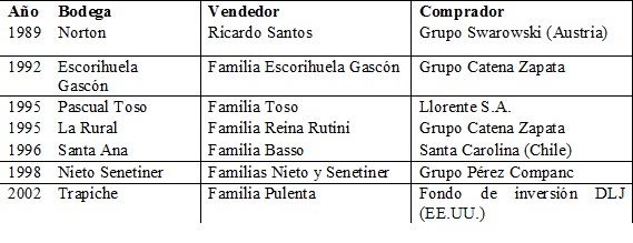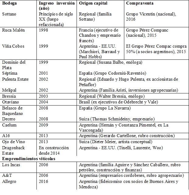Precisamente a esos territorios se ha dirigido el interés de inversores extrarregionales (ya sea nacionales o grupos transnacionales) con el objetivo de participar en los excedentes generados en los segmentos más dinámicos del complejo. El proceso de acumulación del capital ya no es dominado de modo exclusivo por la burguesía regional de las familias tradicionales, sino que participan en él capitales nacionales e internacionales, distinguiéndose un escenario variopinto. Desde pequeños capitales controlados por aficionados al vino —que han acumulado capital gracias a su labor profesional— hasta grandes grupos económicos transnacionales que aprovechan las oportunidades de valorización de capital brindado por la provincia, ya sea por sus condiciones agroecológicas, la preparación de sus profesionales, los hábitos de consumo del país o por sus condiciones para el desarrollo del enoturismo.
