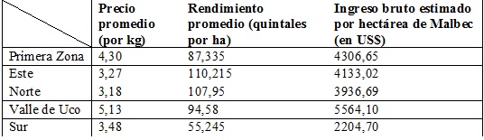Es relevante indicar que las principales razones de la especialización en vinos de alta gama en el Valle de Uco son, según los expertos, la altitud, las temperaturas y las características de sus suelos (pedregosos y arenosos), que permiten concentrar taninos y color en los granos de las uvas; ello se traduce en un potencial para producir vinos de aromas, texturas y sabores diferenciados, con condiciones para la crianza en madera. Con el fin de lograr bajos niveles de productividad por hectárea, las condiciones naturales del terroir suelen ser complementadas con labores culturales en verde, como raleos. Cabe destacar que esta vid —usada para vinos de gama media-alta— tiene un precio más elevado que el mismo varietal en otra zona de la provincia (Tabla 8); por lo cual, paradójicamente, menores rendimientos en un oasis significan mayores ingresos para el productor.