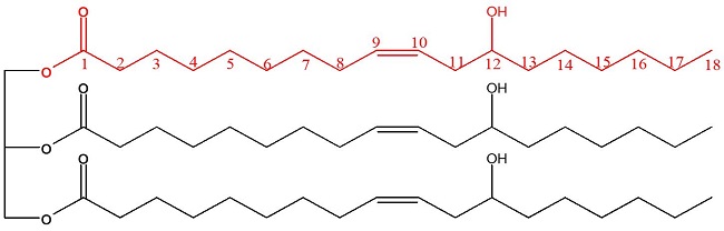 Castor oil presents in its composition 89.5% to 90% triglyceride ricinoleic acid (12-hydroxy-cis-9-octadecenoic acid), whose molecular formula is C17H32OHCOOH. In the ester bonds of the triglyceride (1st carbon) reactions of hydrolysis, esterification, alcoholysis and, halogenation can occur (Figure 1)[9-12].