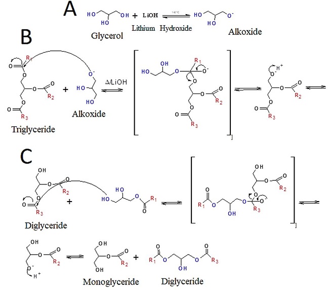 In the present study, the glycerolysis pathway of the triglycerides present in the oil was used (Figure 2). The alkoxide is an active radical formed by the reaction of glycerol with lithium hydroxide (catalyst) (A). The C=O (carbonyl) bond of the triglyceride undergoes nucleophilic attack by alkoxide, forming a tetrahedral intermediate. After rearrangement of this intermediate, a monoalcohol ester and the anion are formed, which, upon deprotonation of the conjugate acid from the base formed in the reaction, it regenerates lithium hydroxide and produces a diglyceride (B). Similar reactions occur with diglycerides, with formation of monoacylglycerol (MAG) (C)[13].