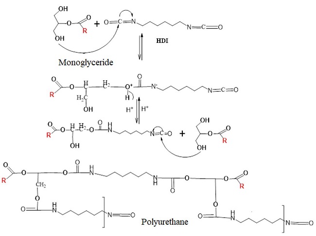 The reaction begins with the attack of the nucleophilic center of the MAG (monoacylglycerol) on the electrophilic carbon of the carbonyl group (C = O) of the isocyanate; the proton is simultaneously transferred to the nitrogen atom. A urethane structure is formed when the hydrogen atom of the hydroxyl group present in the MAG binds to the nitrogen atom of the isocyanate group. The mechanism repeats until the formation of the polyurethane structure[13].