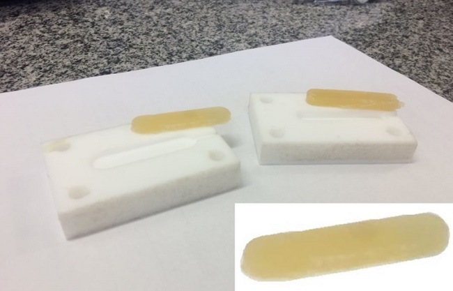 During the final reaction of polyurethanes, curing agents, blowing agents, catalysts and fillers may be incorporated. Hydroxyapatite is a biocompatible and osteoconductive material, serving as a structure for the migration of osteoprogenitor cells[8-10]. The last step to obtain the composite was conducted through the addition of hydroxyapatite. The mixture was stored in a suitable container in order to wait for curing time of the material. Samples of the pure polyurethane and proportion of hydroxyapatite at 3% by mass were obtained (Figure 4).