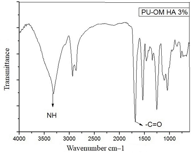 The FTIR analysis performed on the polyurethane samples obtained by the chemical processing of castor oil with addition of 3% hydroxyapatite (HA) is shown in Figure 6. It is possible to observe the regions that prove the formation of the polymer.