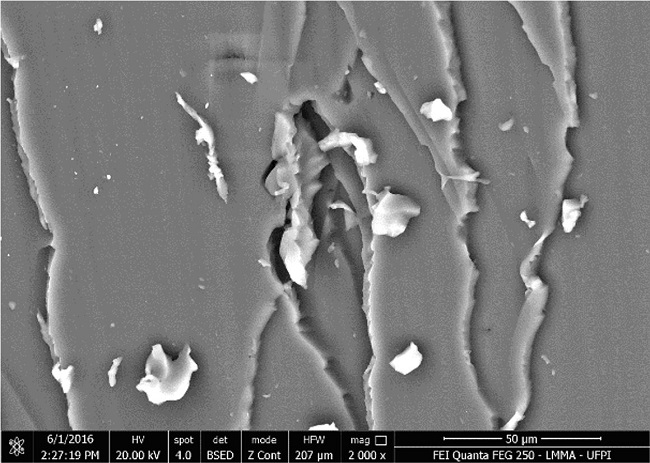 Figure 8 shows the microphotograph of polyurethane with addition of 3% HA. According to Pradhan and Nayak[9], the gray regions indicate the polymer matrix and the bright spots indicate the distribution of hydroxyapatite particles.