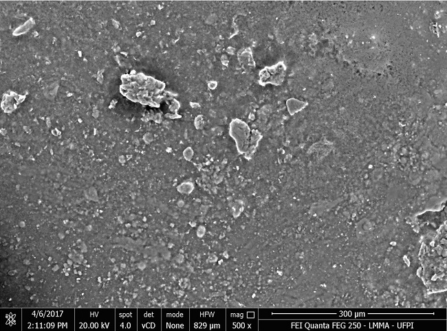 Figure 7 shows the microstructural analysis by Electron Microscopy of the polyurethane derived from castor oil without addition of hydroxyapatite. Flat and homogeneous surface, with evenly distributed protrusions and depressions; besides clearer granular structures suggestive of artifacts by residual material was observed.
