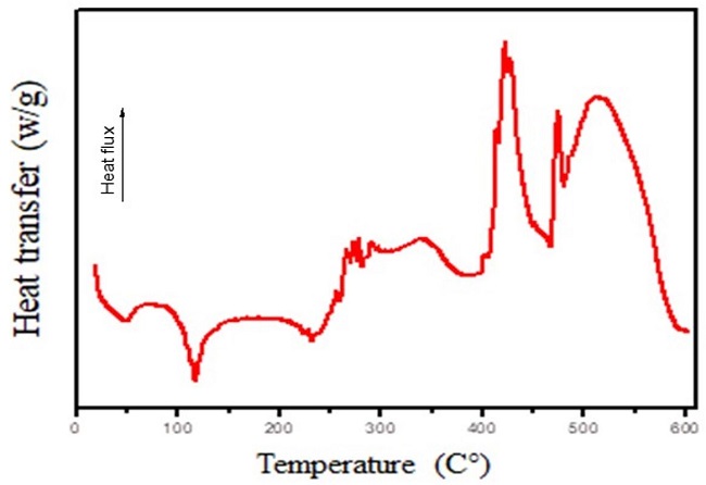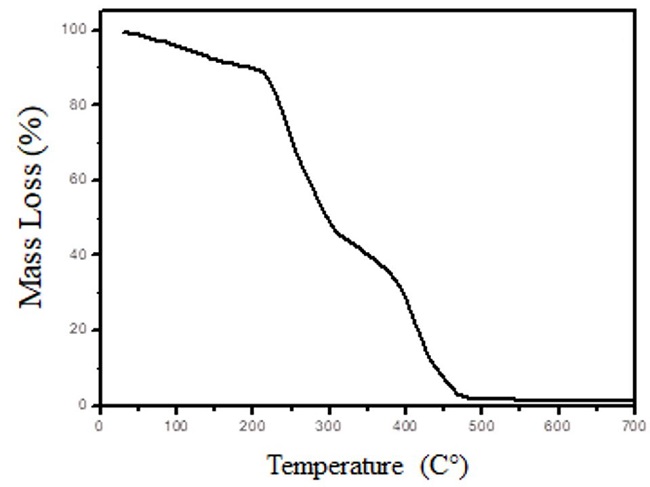 Polyurethanes generally decompose into two or three events due to structural differences[15,16].The biomaterial showed thermal stability up to 50 °C, from which two thermal decomposition peaks and reduction of the initial sample mass were observed, which one peak was in the range of 200 to 250 °C and another peak was in the 350 °C temperature range (Figure 11). It is verified that the degradation process occurred in different stages.