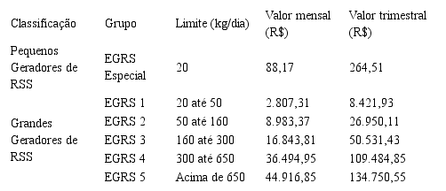 Os valores a serem pagos aumentam de forma exponencial, em relação à massa gerada, sendo os estabelecimentos geradores de resíduos sólidos (EGRS) de serviços de saúde classificados como demonstrado na Tabela 1 (Prefeitura de São Paulo, 2015):