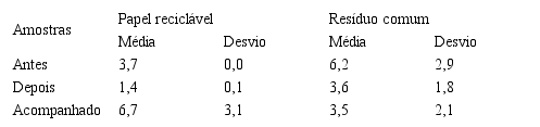 O percentual do papel reciclável segregado em relação ao total dos resíduos comuns das amostras foi calculado para verificar se houve aumento na recuperação de papel reciclável. Paralelamente, a correlação r de Spearman foi verificada (Zar, 2009), entre os valores de papel reciclável e os demais resíduos comuns.
