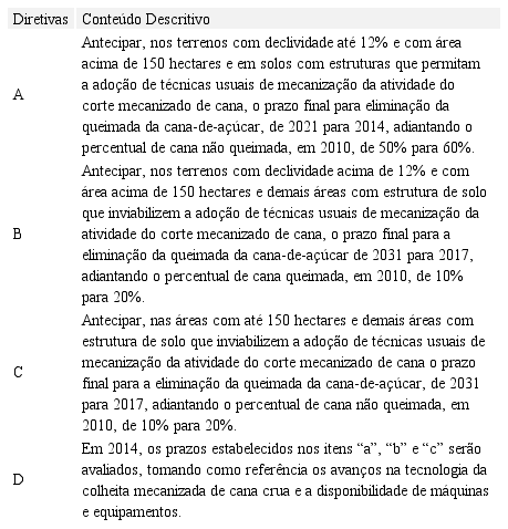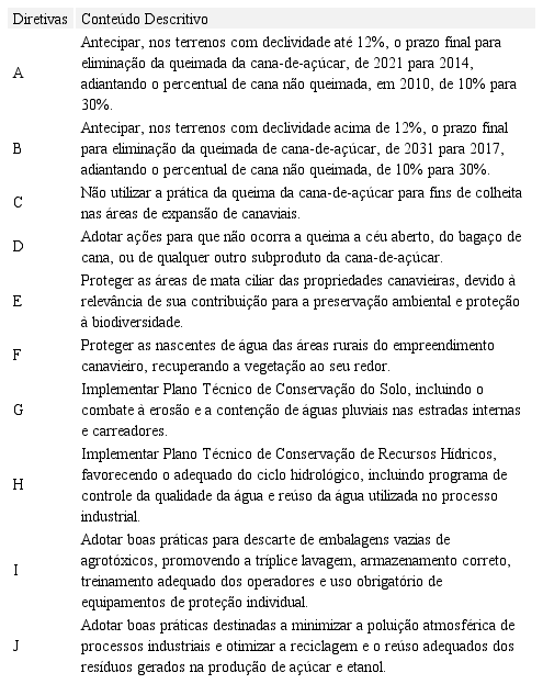 O Protocolo Agroambiental define diretivas técnicas ambientais a serem implementadas e executadas pelas agroindústrias signatárias. O Quadro 1 descreve as diretivas técnicas do Protocolo Agroambiental para as unidades agroindustriais.