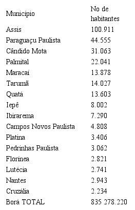 A Tabela 1 apresenta os dezessete municípios que formam a mesorregião de Assis-SP, seus respectivos números de habitantes, com destaque para os municípios onde estão localizados as agroindústrias e fornecedores pesquisados.