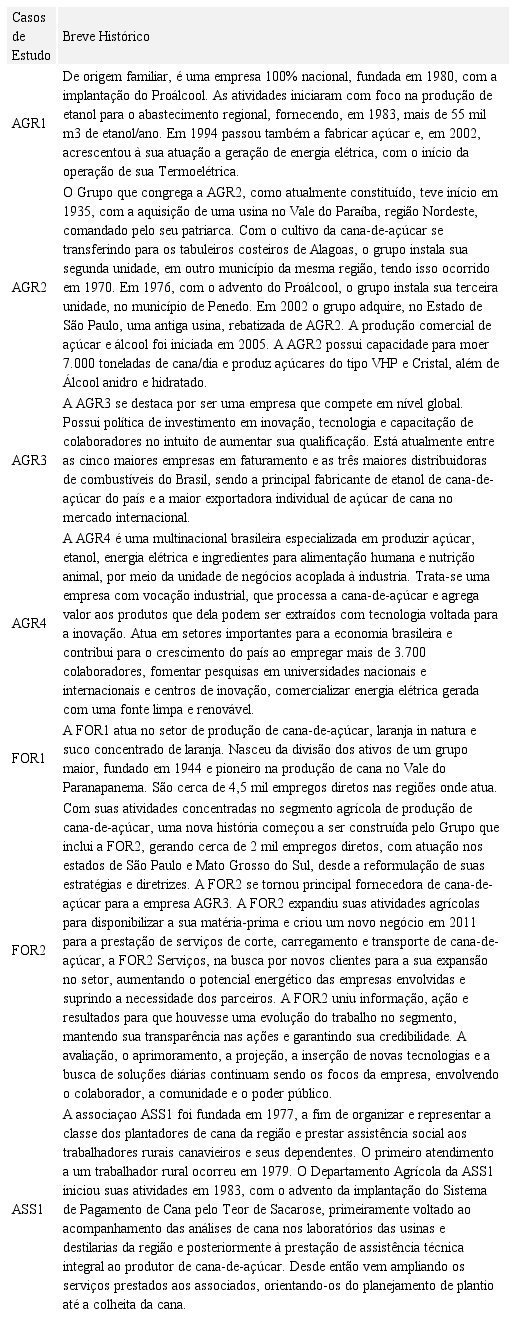 O Quadro 3 apresenta, resumidamente, a caracterização histórica de cada um dos casos em que atuam os gestores que participaram da pesquisa, composto por 4 produtores, 2 fornecedores e uma associação.