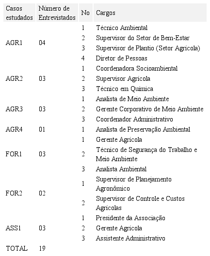 Em todas as organizações, com exceção da AGR4, foi possível entrevistar mais de uma pessoa que estava ligada diretamente às questões ambientais da empresa. A maioria dos gestores entrevistados confirmou ter dado mais ênfase às questões ambientais a partir da adesão ao Protocolo Agroambiental, o que pode ser constatado nos excertos transcritos das entrevistas realizadas com os técnicos. O Quadro 4 apresenta os entrevistados e seus respectivos cargos nas organizações.