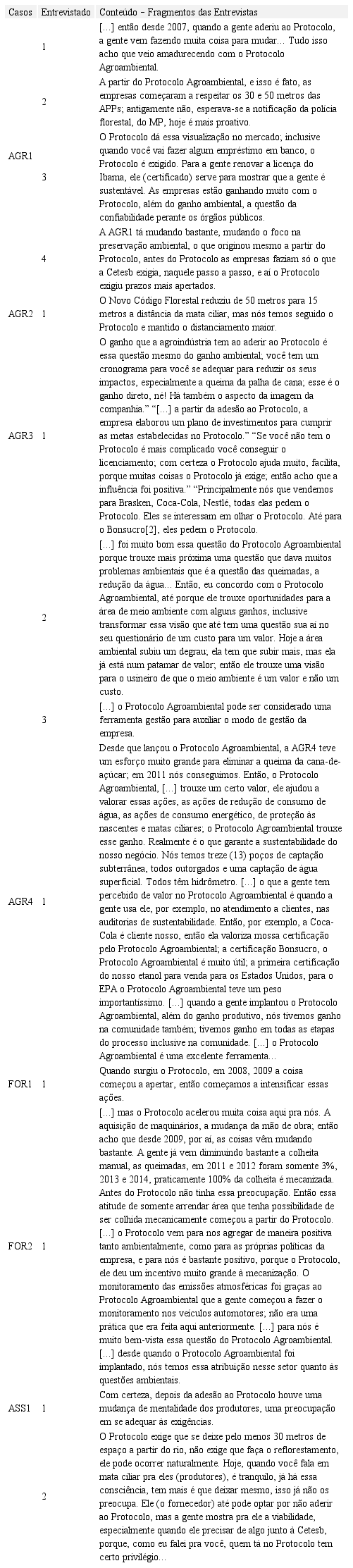 Esta pesquisa objetivou apurar a influência do Protocolo Agroambiental no processo de gestão ambiental empresarial, a partir da percepção dos gestores das agroindústrias e fornecedores situados na mesorregião de Assis-SP. Embora tenham sido entrevistados dezenove profissionais de todos os casos estudados (Quadro 4), para o alcance do objetivo proposto para esta pesquisa foi suficiente a análise de excertos de entrevistas de treze gestores ambientais, distribuídos entre todas as unidades pesquisadas (Quadro 5).