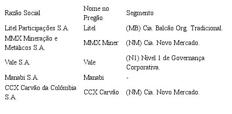 BM&FBOVESPA. Empresas Listadas na BM&FBOVESPA (2014) do setor de atuação Materiais Básicos, pertencentes ao Subsetor Mineração, do Segmento Minerais Metálicos. Disponível em: ˂http://www.bmfbovespa.com.br/Cias-Listadas/Empresas-Listadas/BuscaEmpresaListada.aspx?segmento=Minerais+Met%C3%A1licos&idioma=pt-br˃. Acesso em: 20 ago. 2014.