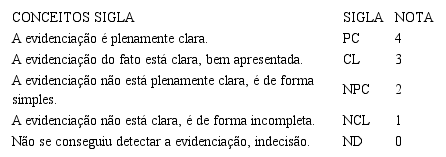 Considerou-se que a evidenciação não está plenamente clara (nota 2), quando na descrição não se informam precisamente os detalhes de quanto foi investido e gasto em moeda corrente nas práticas ambientais, tratando-se de informações sobre investimentos, gastos, inclusive da quantidade de processos e multas, ou seja, só há alguns comentários sobre a questão ambiental, sem precisão dos fatos. Já a evidenciação de forma não clara (nota 1) é quando a informação está totalmente incompleta, ou seja, somente há menção do fato, sem nenhum detalhe preciso de forma qualitativa e quantitativa. Nesse caso, comenta-se que a empresa faz investimentos, tem práticas ambientais, mas não informam quais, nem valores investidos.
