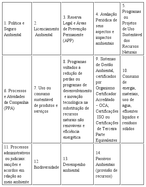 O objetivo de investigar o “Desempenho Ambiental” da companhia, conforme parâmetro do Questionário ISE (2014), é investigar a adoção de referência superior aos parâmetros legais e ocorre quando a organização, além de buscar a conformidade legal, define metas e critérios de monitoramento que superam os requisitos legais. Tal condição pode ser configurada por metas associadas ao desempenho operacional ou a práticas de gestão não requeridas por legislação (por exemplo, realização de inventário de carbono, cálculo de pegada hídrica, de carbono ou florestal).