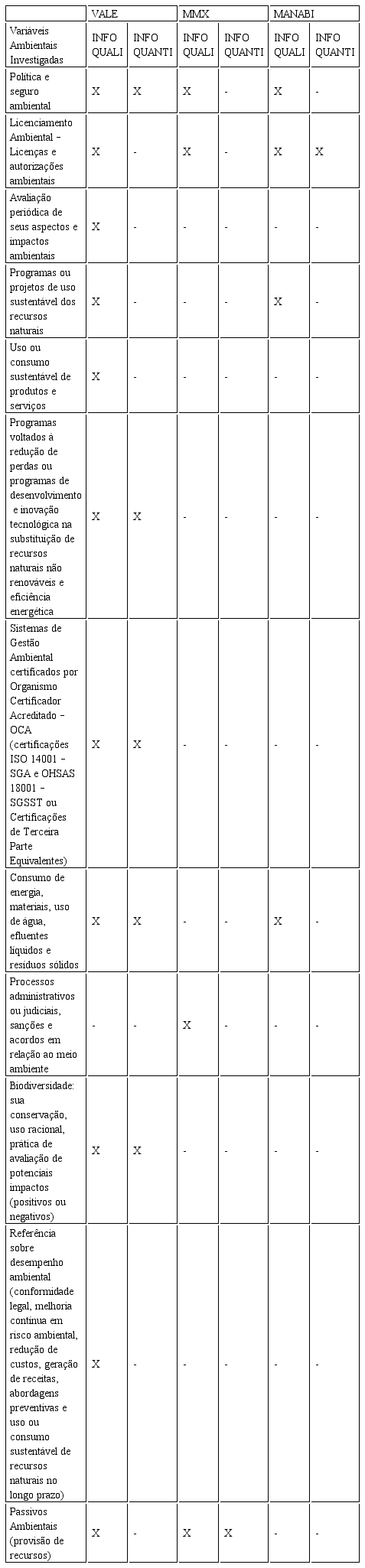 Com base nas variáveis (palavras-chave nos documentos que apresentam evidenciação), procedeu-se a uma análise em que, por meio de quadros, foram identificadas somente as variáveis em que aparecem informações qualitativas (descrição) e/ou quantitativas (em moeda). Posteriormente, para fundamentar a análise desses quadros, verificaram-se as principais práticas operacionais e ambientais para fornecer subsídios necessários para identificar os itens ambientais das empresas brasileiras do setor de Minerais Metálicos dos anos de 2009 a 2013.