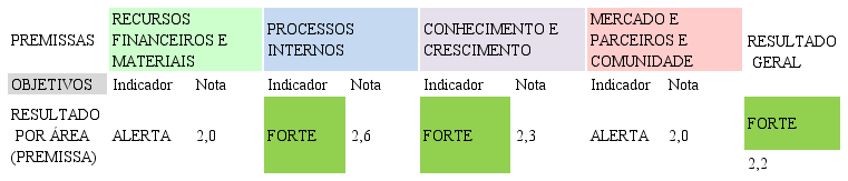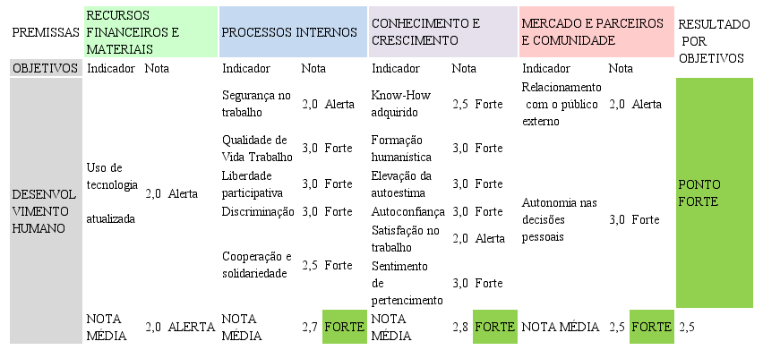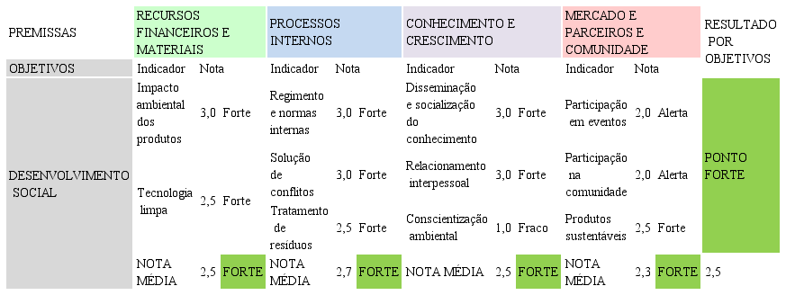 Para cada premissa foram identificados indicadores que pudessem ajudar a avaliar o alcance dos objetivos almejados. A escolha desses indicadores foi realizada a partir da seguinte pergunta: Quais são os fatores (recursos, processos, conhecimento e mercado) essenciais na gestão que podem contribuir para o desenvolvimento sustentável da Cooperárvore e, consequentemente, contribuir para o alcance de sua missão?