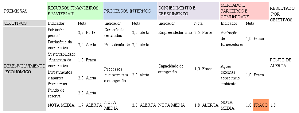Na avaliação geral, o desenvolvimento econômico das cooperadas foi o objetivo que teve o menor alcance, uma nota geral de 1,8 e classificação como ponto de alerta. Em termos de recursos, o poder aquisitivo das cooperadas aumentou, bem como o patrimônio e a capacidade de consumo de muitas delas. No entanto, o patrimônio da cooperativa adquirido com recursos próprios continua num estágio embrionário, conforme Quadro 05. Na avaliação geral, o desempenho alcançado nesse quesito, desenvolvimento econômico, não é bem considerado ao ter obtido 1,8 de nota, indicando, pela nossa metodologia, uma situação de alerta quanto ao cumprimento dessa missão pela cooperativa.
